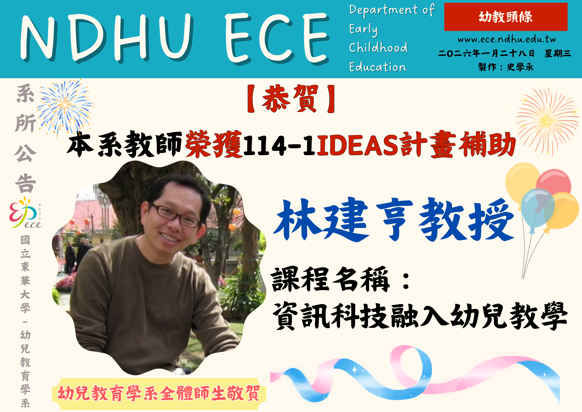 【恭賀】本系林建亨教授榮獲114-1 IDEAS計畫補助