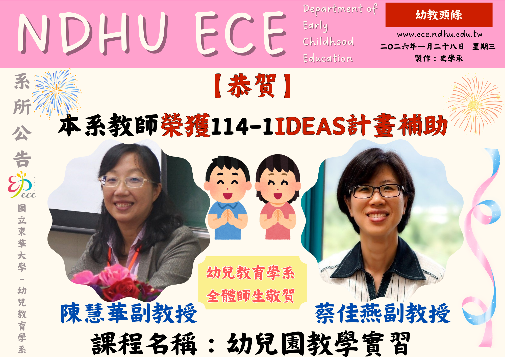 【恭賀】本系陳慧華副教授與蔡佳燕副教授榮獲114-1 IDEAS計畫補助