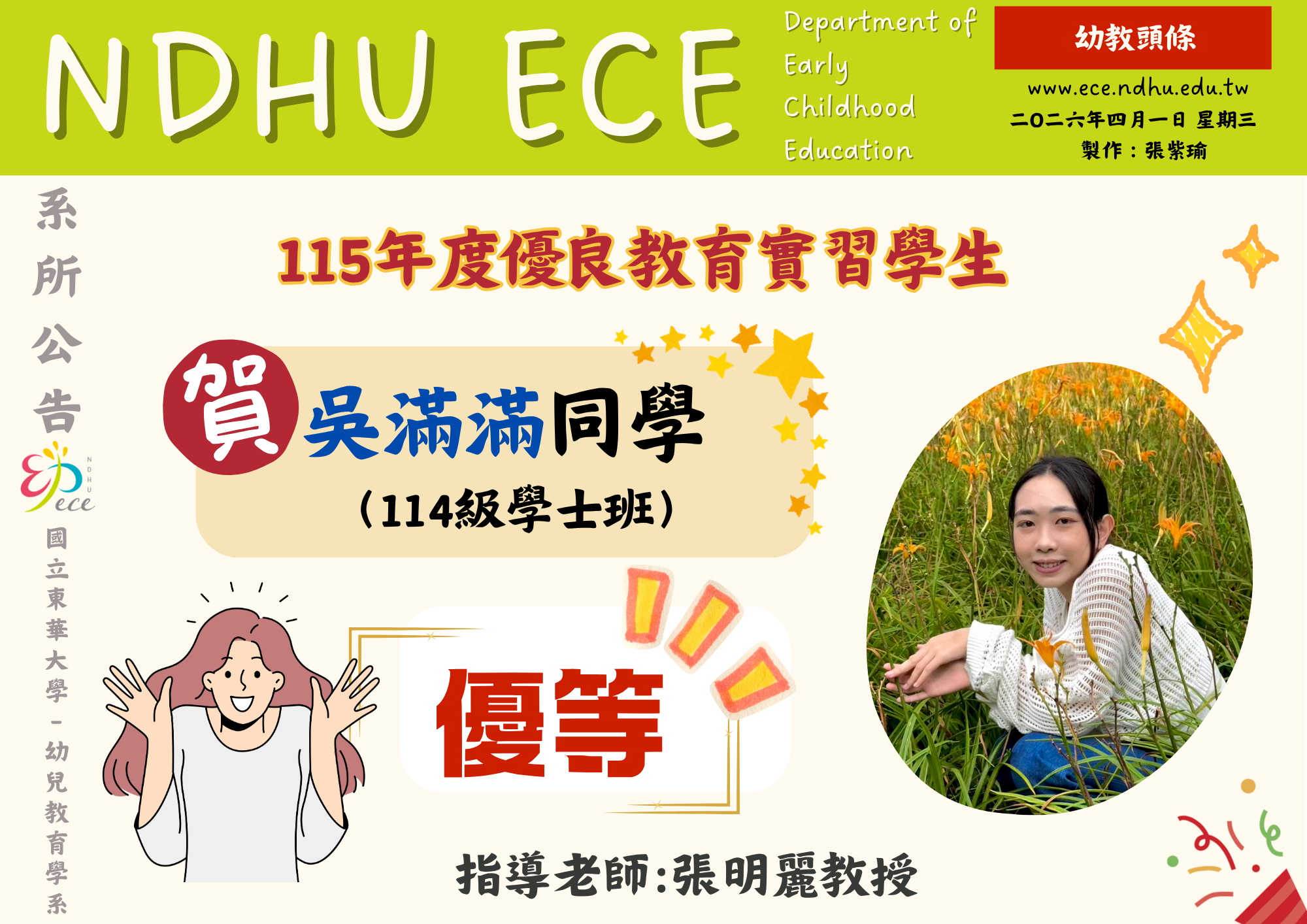 【恭賀】吳滿滿同學榮獲115年度優良教育實習學生優等