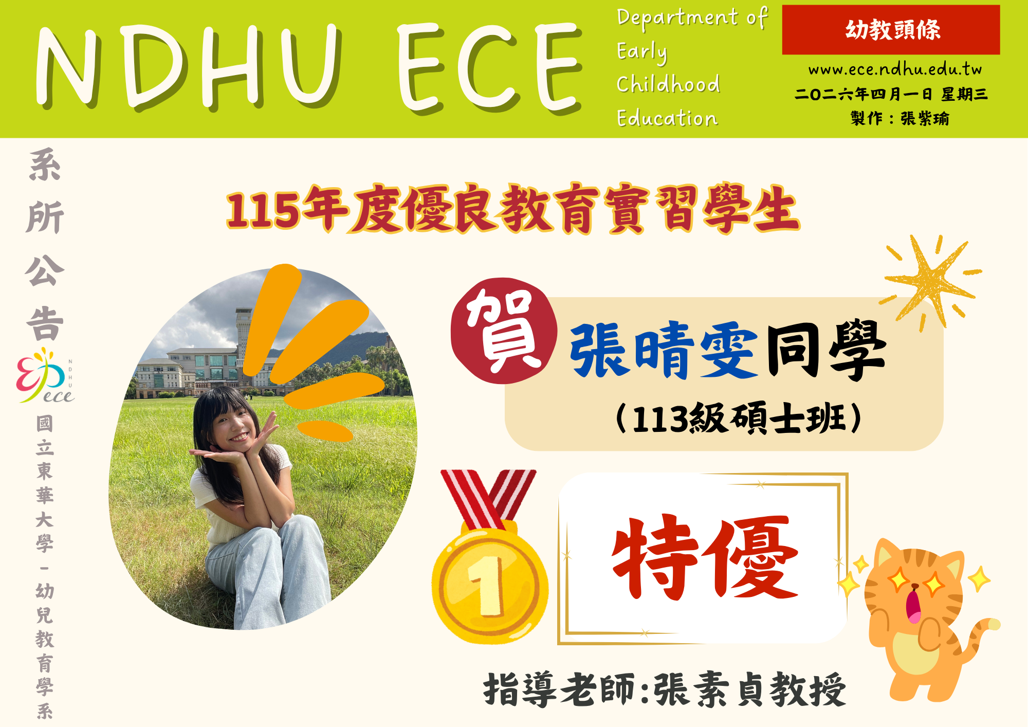 【恭賀】張晴雯同學榮獲115年度優良教育實習學生特優