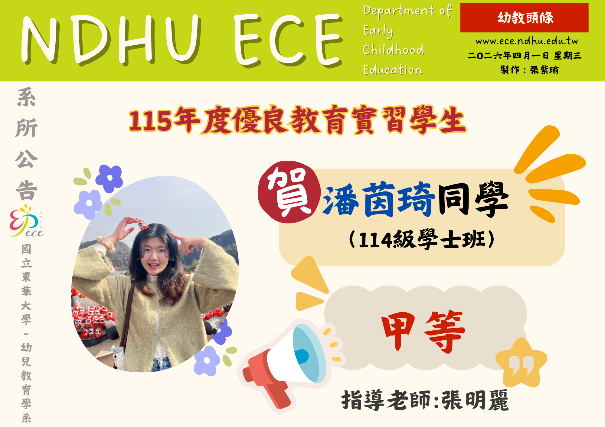 【恭賀】潘茵琦同學榮獲115年度優良教育實習學生甲等
