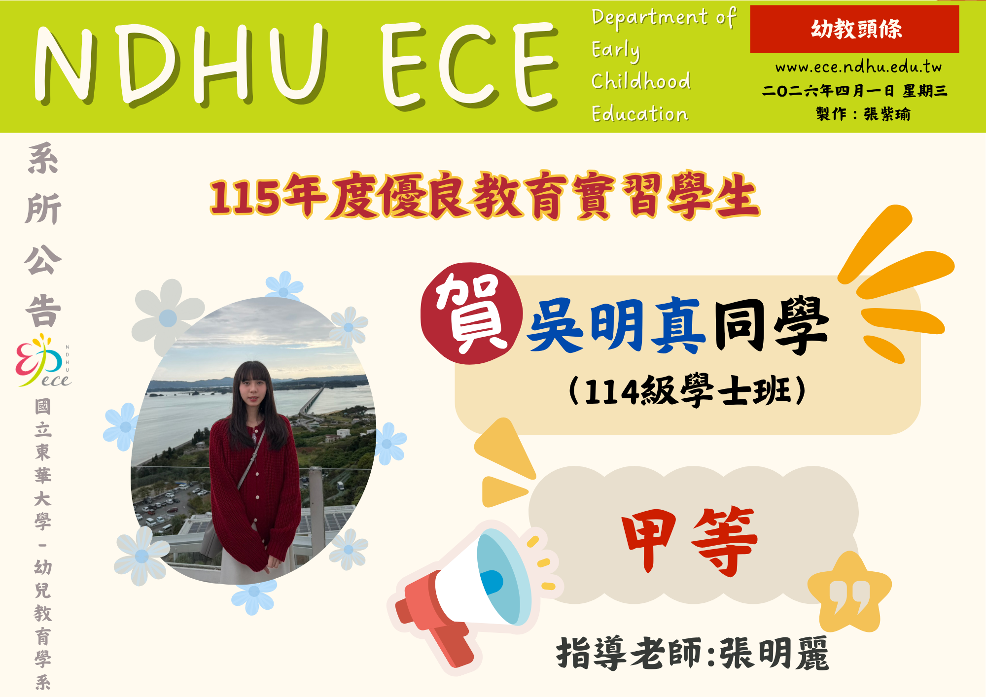 【恭賀】吳明真同學榮獲115年度優良教育實習學生甲等