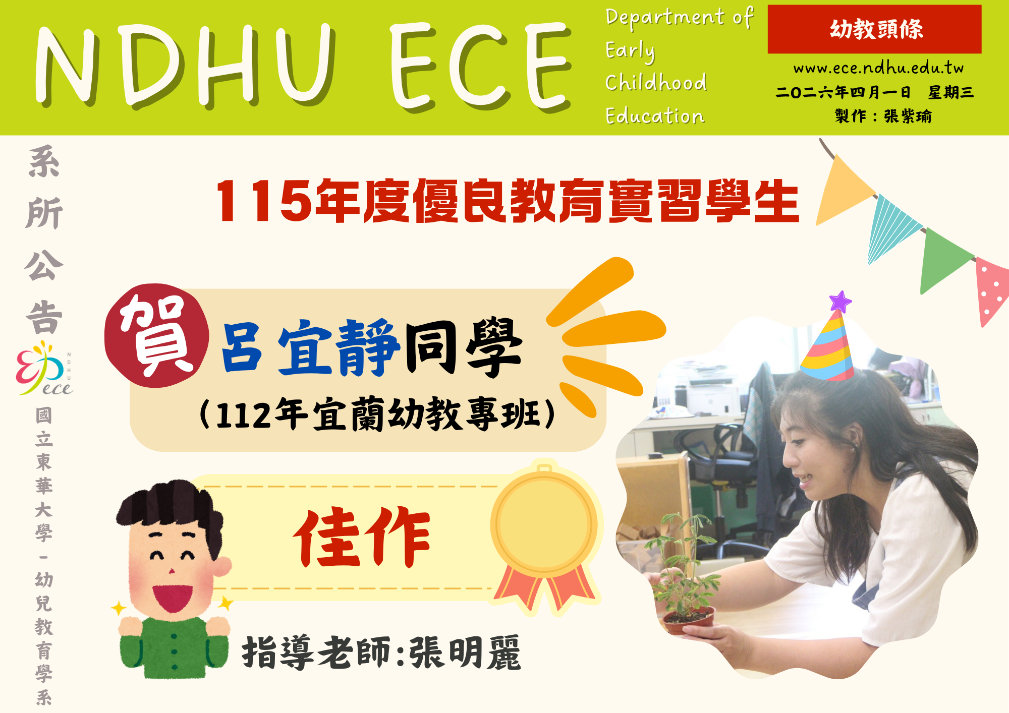 【恭賀】呂宜靜同學榮獲115年度優良教育實習學生佳作