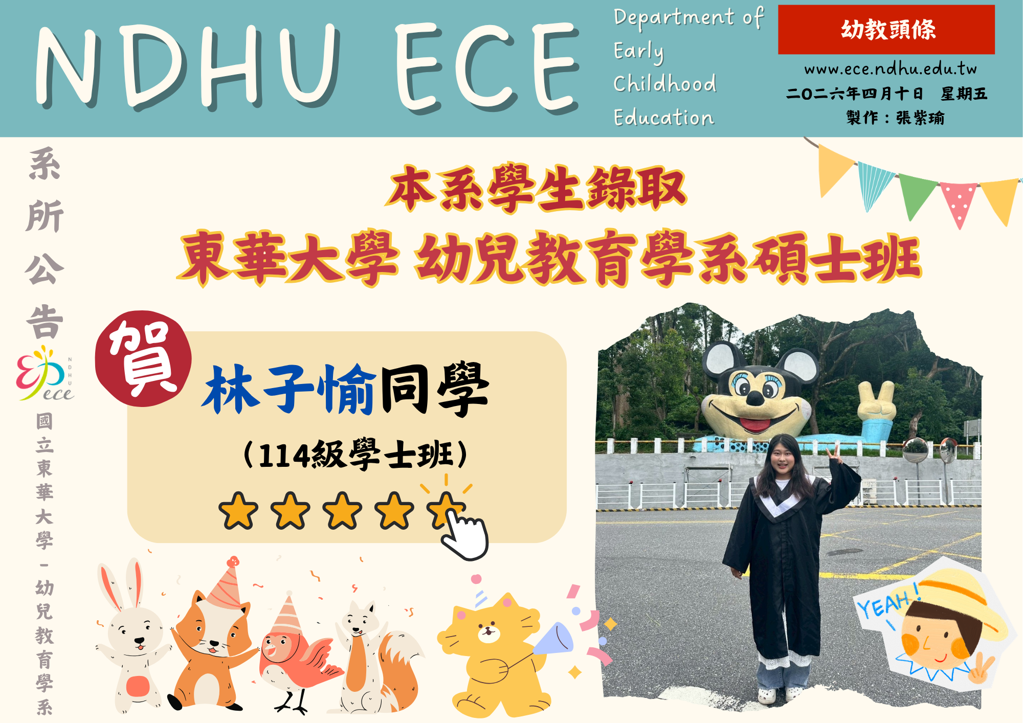【恭賀】本系林子愉同學錄取東華大學幼兒教育學系碩士班