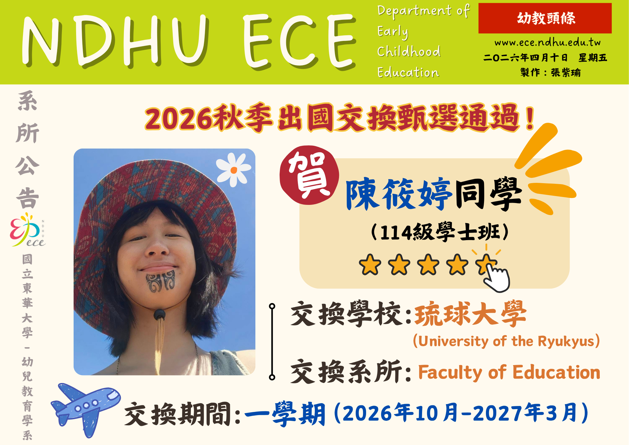 【恭賀】陳筱婷同學通過2026秋季出國交換甄選